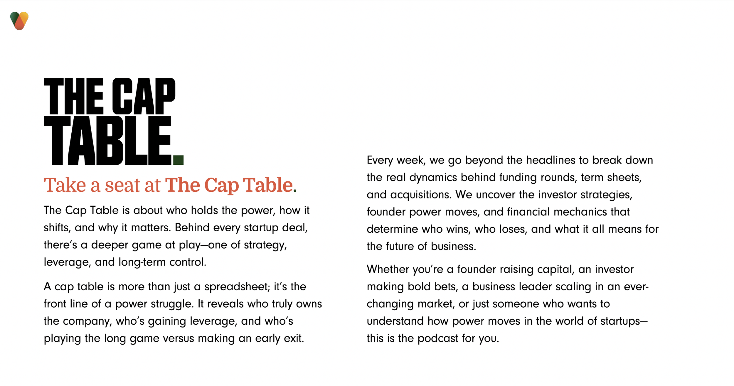 One example was The Cap Table, a podcast concept built around ownership, leverage, and the power dynamics behind venture and startup growth. The work included naming, positioning, and tonal framing designed to make the concept feel sharp, credible, and aligned with the larger Venture Backed brand.