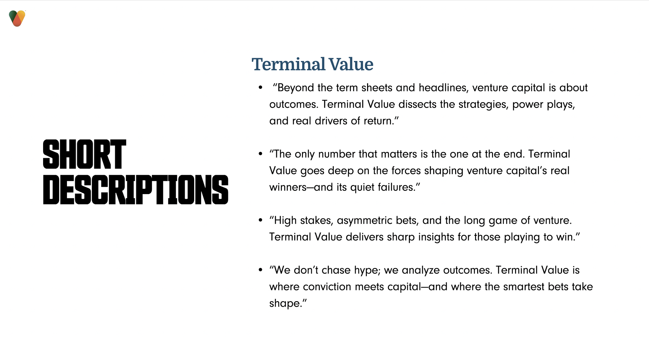 Built for investors, Terminal Value leaned more analytical and long-range, with messaging centered on outcomes, strategy, and market perspective.